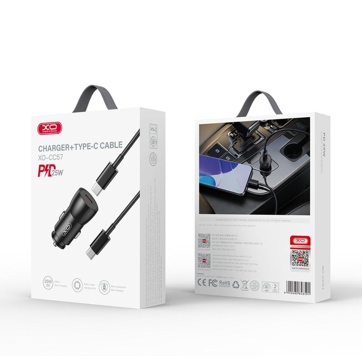 XO incarcator auto 25W USB-C + cablu USB-C la USB-C, negru (model CC57)